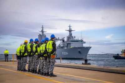 Auxiliary Oiler Replenisher NUSHIP Stalwart prepares to berth at Fleet Base West in Western Australia for the first time.After a 30 day transit across the world’s oceans, NUSHIP Stalwart arrived safely at Fleet Base West in Western Australia on Monday, 21 June 2021.